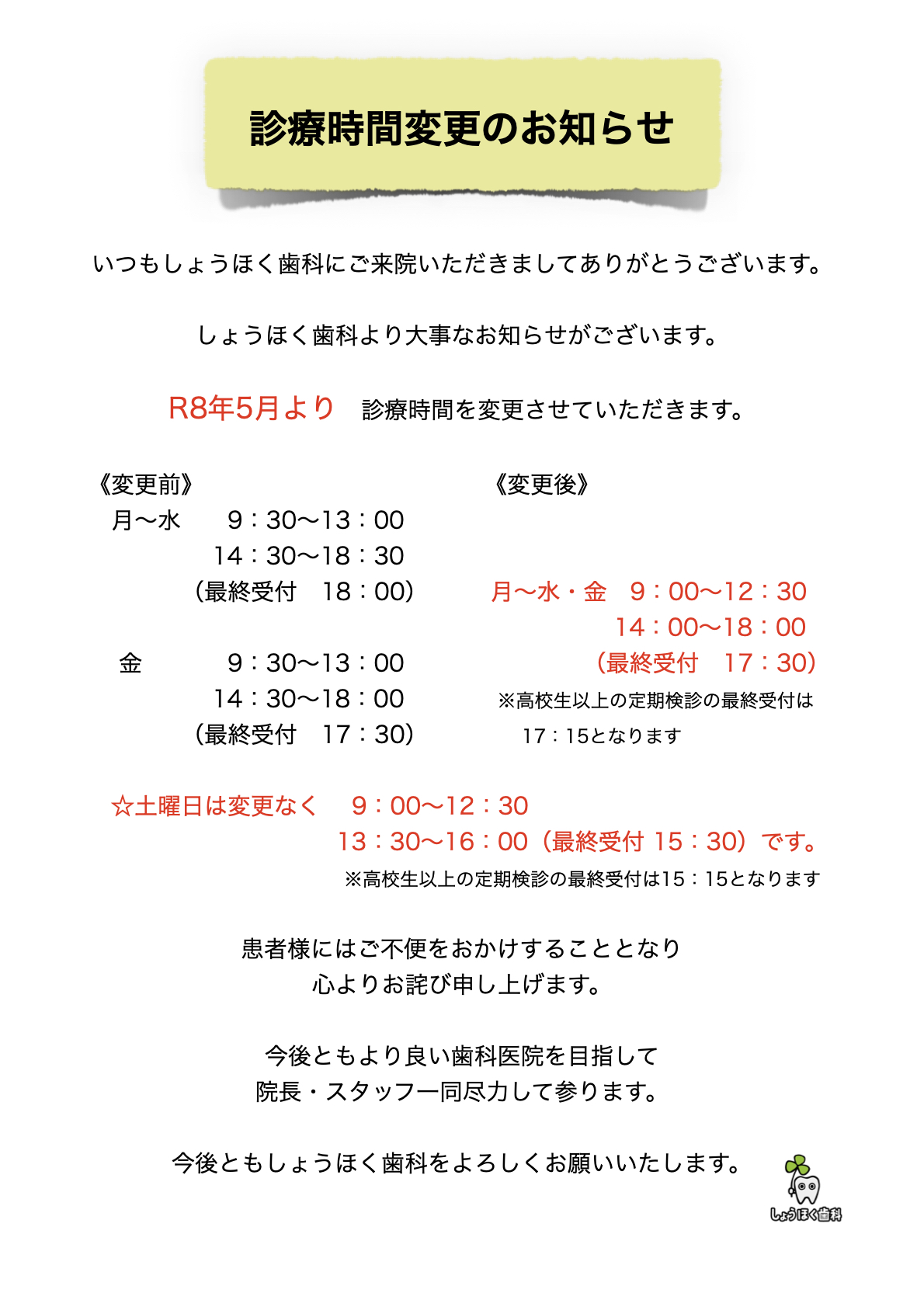 診療時間変更のお知らせ こんにちは。いつもしょうほく歯科をご利用いただきまして ありがとうございます。 おかげさまで今年で11年目を迎えることとなり、皆様のお力添えのもと ここまでやってくることができました。 今後ともより良いサービスを提供していくために 令和8年5月より診療時間を変更させていただくこととなりました。 ご迷惑をおかけしますが、今後ともしょうほく歯科を よろしくお願いいたします。 お知らせ一覧topics